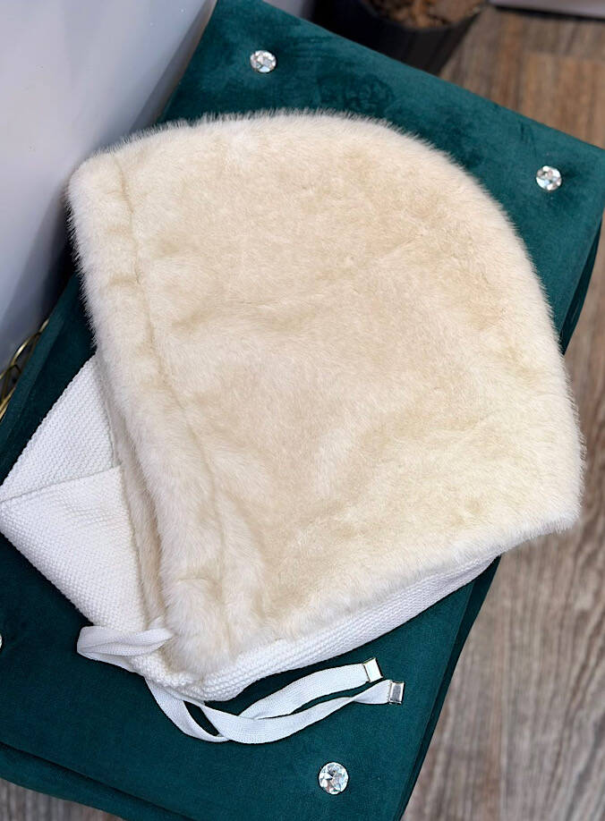 Капор плюшевий з еко-хутра білий з довʼязом,має теплий підклад,виробник Україна